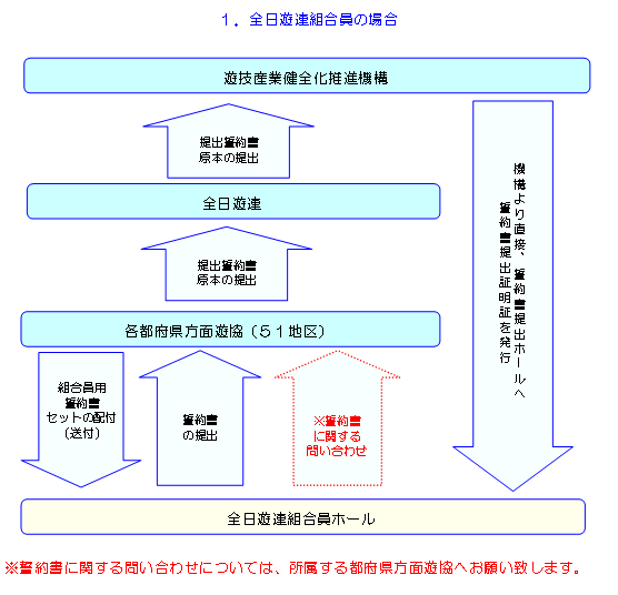 ○誓約書見本(PDF) ・法人用 ・個人用 全日本遊技事業協同組合連合会(全日遊連)傘下の51都府県方面遊協に所属しているホールは、当該地区の都府県方面遊協より「誓約書セット」が送付、または会議等で配布されますので、 セットの内容をご確認の上、所属する都府県方面遊協へ「誓約書」を提出してください。 なお、提出方法・ご質問等は、所属する都府県方面遊協へお問合せください。 ![]()
