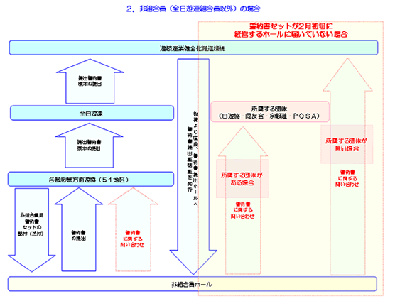 ・法人用 ・個人用 当該地区を管轄する都府県方面遊協より「誓約書セット」が送付、または会議等で配付されますので、セットの内容をご確認の上、管轄する都府県方面遊協へ「誓約書」をご提出ください。 なお、提出方法・ご質問等は、管轄する都府県遊協へお問合せください。 注:「誓約書セット」が2月初旬までに経営されるホールに届かない場合は、所属される団体 (日遊協・同友会・余暇進・PCSA)へお問合せください。 なお、前記4団体にも所属されていない場合は、機構(連絡先.PDF)に直接お問合せください。 機構から直接、「誓約書セット」をお送り致します。 ![]() |