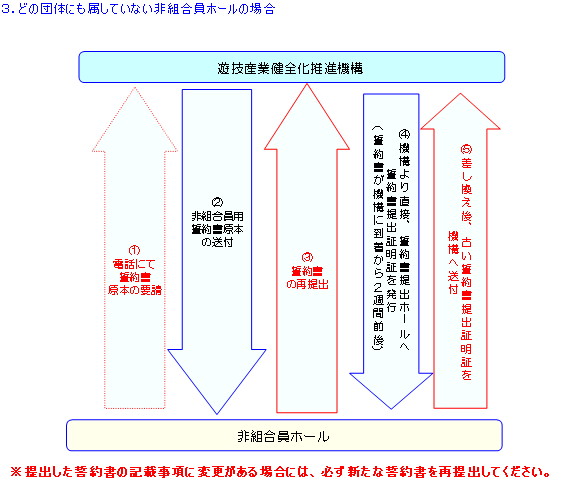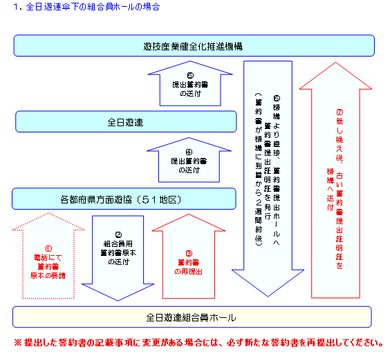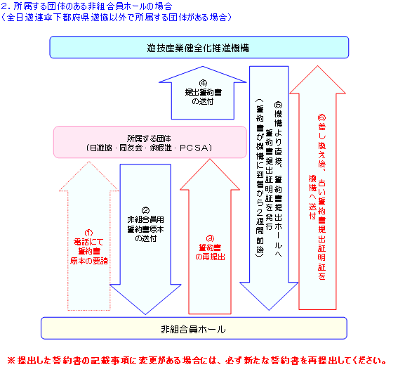 上記、誓約書記載事項の一切の変更については、全て新規の誓約書にご記入いただいた上、再提出をしていただきます。 その際、全日遊連傘下の組合員ホール様につきましては、所属する都府県方面組合にお問合せの上、誓約書原本をお求めください。 組合等に所属されていないホール様につきましては、機構ホームページお問合せフォームよりご要請いただくか、機構(03-3518-2062)まで直接お問合せください。 新たに誓約書を提出していただいた際には、必ず、誓約書提出証明証を提出ホール宛に直接お送りいたしますので、到着次第、 変更前の誓約書提出証明証と差し替えていただき、店舗への掲示をお願いします。差し替え後、変更前の証明証につきましては、機構まで必ず返送をお願い致します。