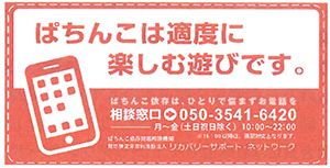 11月上旬を目途として当機構事務局並びに「依存防止対策セット」発送業務を委託した業者内に各パチンコホール関係者の方専用の相談窓口を設置する予定ですので、承諾書の提出や依存防止対策調査の方法等に関し、ご不明な点がありましたらお問い合わせをお願い致します。