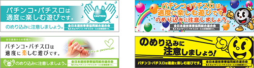 本調査項目の「のめり込み防止標語」デザインは全日遊連バージョンと21世紀会バージョンがあり、どちらも以下のホームページからダウンロード可能です。尚、掲載されるには指定された面積等といった注意事項をご確認頂き、必ず使用条件を遵守し、ご使用ください。